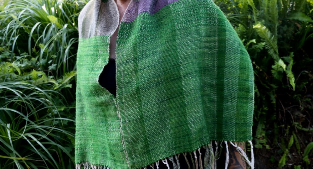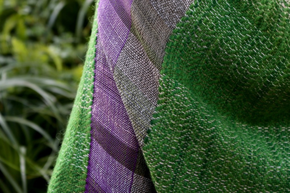 this piece has a linen warp and is woven with hand dyed awapara wool yarn in a vibrant green, with some blocks of Japanese purple silks and linens that I sourced on a recent trip there.